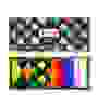 Ein rechteckiger Rahmen, der in drei Teile unterteilt ist. Auf der linken Seite ist ein blaues Rechteck, das zwei Paar Socken aus der Happy Socks-Kinderkollektion enthält, eines weiß mit schwarzem Leopardenmuster und eines rot mit weißen Tigerstreifen, beide mit Augen und einem breiten Lächeln. In der oberen rechten Ecke befindet sich ein gelbes Quadrat mit dem Gesicht einer lächelnden Katze. Darunter ist ein rotes Quadrat mit der Aufschrift „Auf Zehenspitzen unterwegs“.